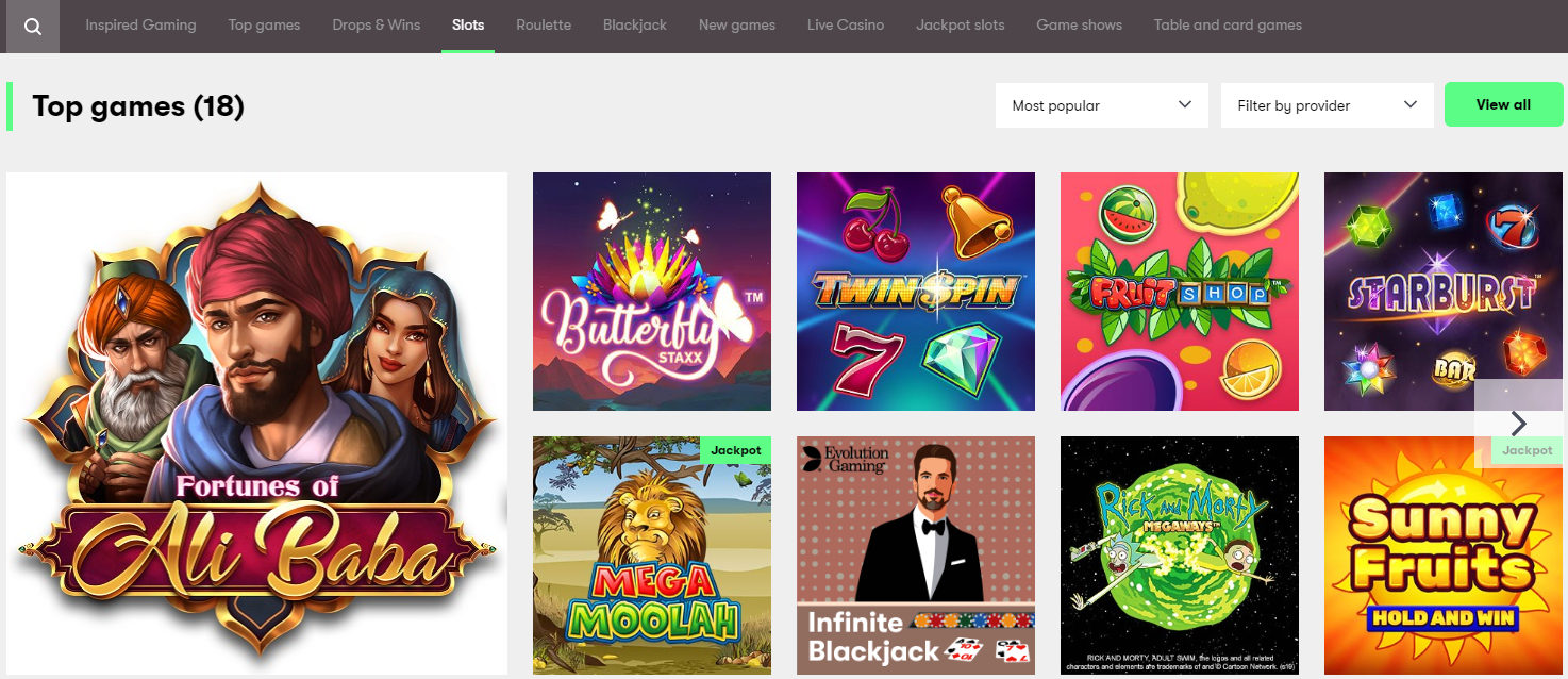 - Jackpot slots. The big money option for fans of slots gaming. A wide range of different styles of game available. At the time of writing, popular options include Golden Goal, Rambo, and Bell Of Fortune.