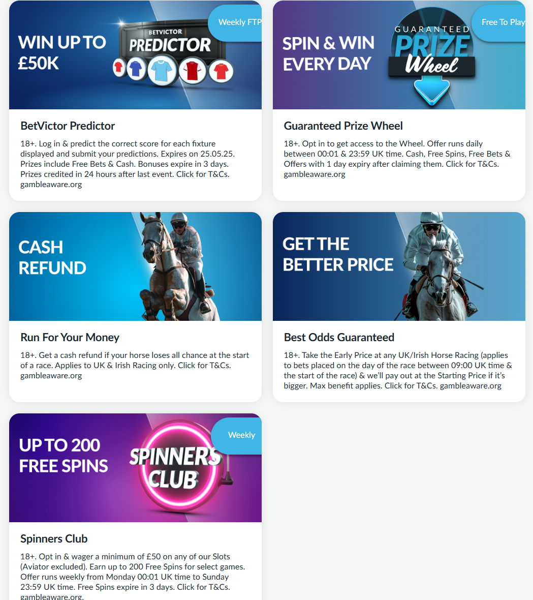 - Enhanced Odds/Price Boosts: Bet Victor frequently boosts odds on high-profile matches or races, offering better returns. Think Manchester United to win at 5/1 instead of 3/1—perfect for maximising profits.