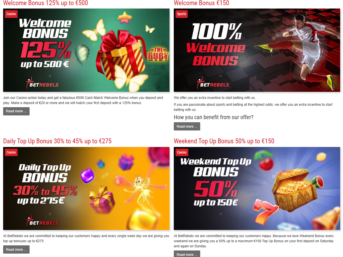 - Casino Welcome Bonus: For casino enthusiasts, BetRebels offers a 125% match bonus up to €250 on the first deposit. The minimum deposit is €20, with a 45x wagering requirement on slots, to be met within 30 days. The maximum bet while using this bonus is €5 per spin.