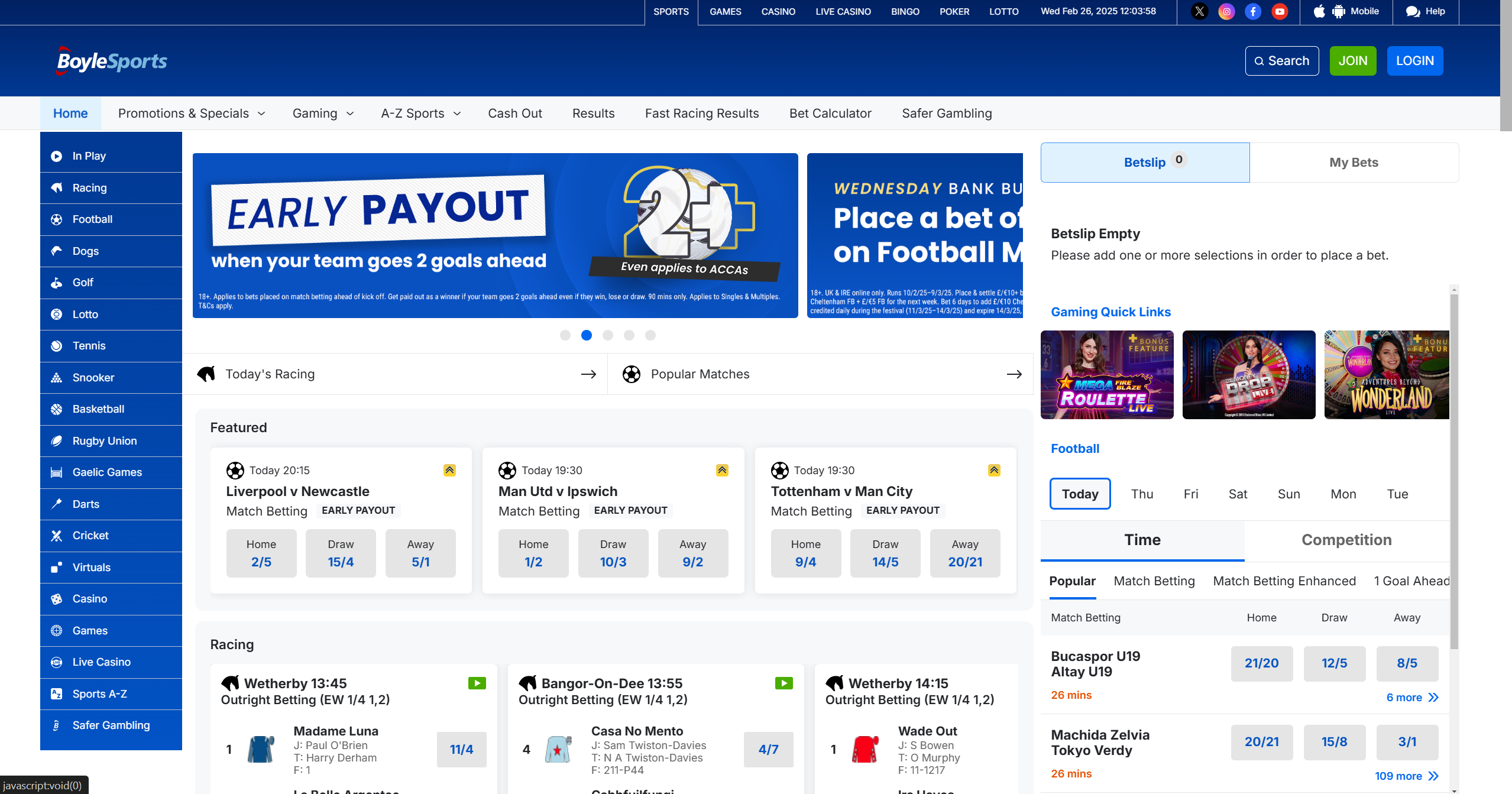 BoyleSports offers an extensive sports betting portfolio, covering over 30 sports ranging from mainstream options to niche interests. Popular sports include football, horse racing, tennis, golf, and basketball, while less common offerings like Gaelic games, bowls, and eSports broaden its appeal. The platform also features virtual sports, providing simulated events for continuous betting opportunities.