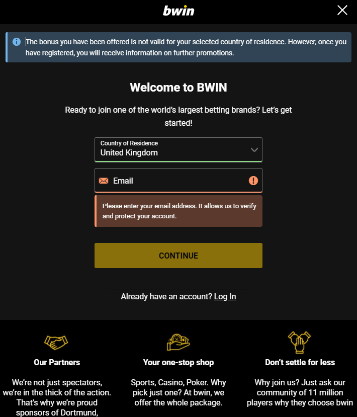 - Visit the Bwin website or app and click the yellow “Register” button.