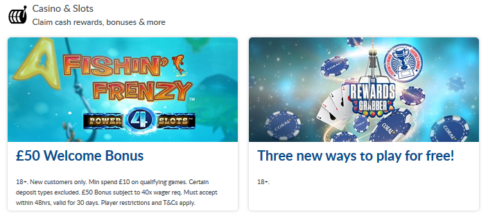 £50 welcome bonus. This is the most attractive part of the new customer offer for Coral Casino. When you deposit at least £10, you receive £50 to bet on casino games. This is subject to wagering and other requirements.