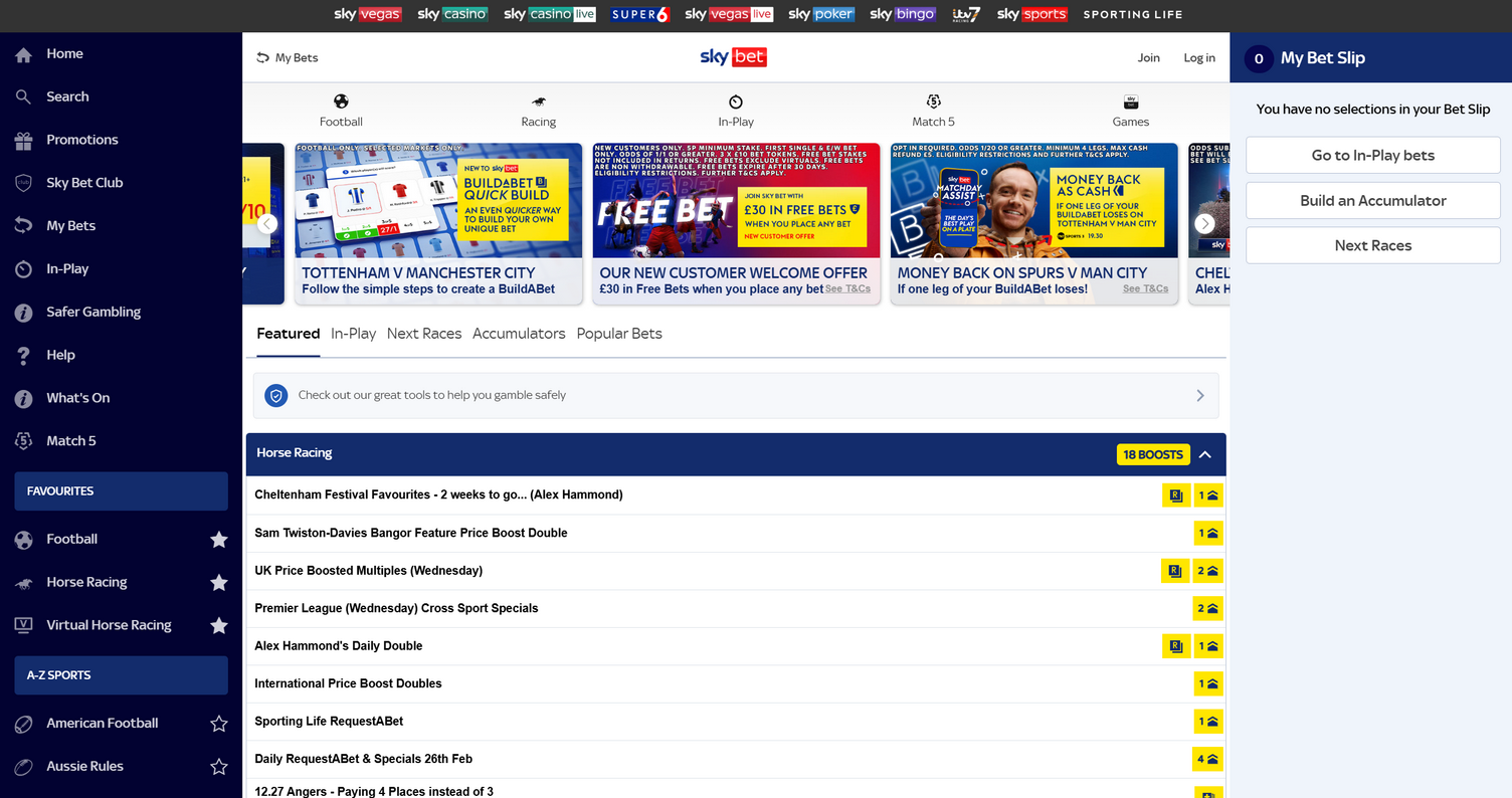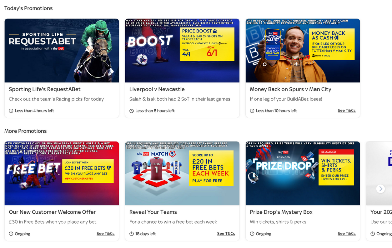 - Sky Bet Club: A loyalty program for active users, offering a £5 free bet weekly if you wager £25 or more between Monday and Sunday. Users must opt-in to participate, and the free bet is non-withdrawable.
